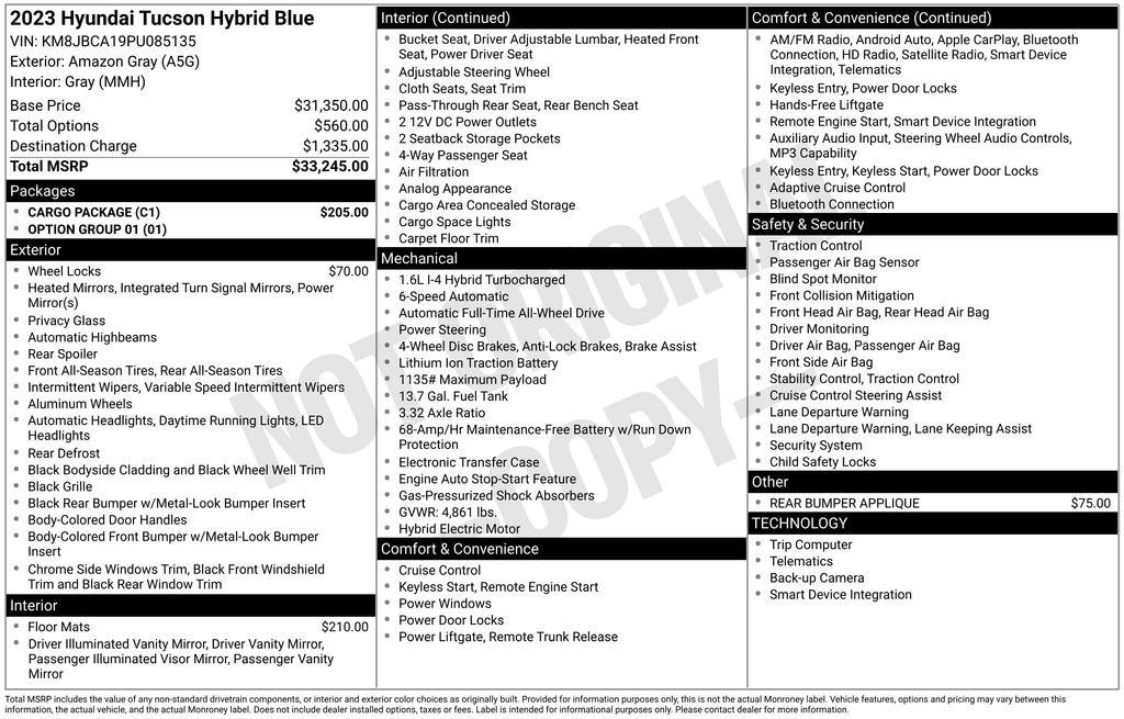 Certified. Amazon Gray 2023 Hyundai Tucson Hybrid Blue AWD 6-Speed Automatic I4 38/38 City/Highway MPG Hyundai Details: