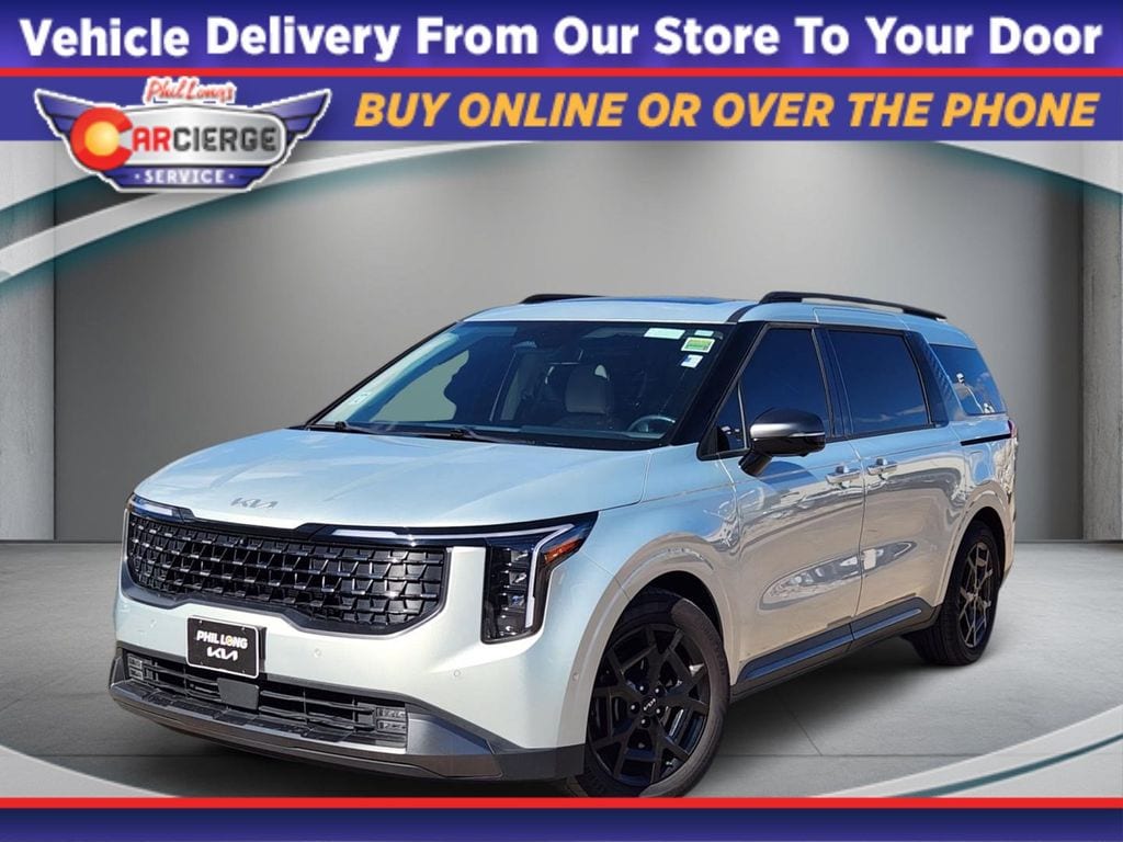 REAR SEAT ENTERTAINMENT PACKAGE Dual Screen Rear Seat Entertainment System, SX DARK EDITION PACKAGE Wheels: 7.5J x 19 Alloy Dark Edition, Black customizing, Dark Edition Exterior Design, dark edition skid plates and C-pillar, Dark Edition Front Grille Trim, Dark Edition Mirror Caps, CARPETED FLOOR MATS (8-PASSENGER). Kia SX with Ivory Silver exterior and Navy/Gray interior features a V6 Cylinder Engine with 287 HP at 6400 RPM*.