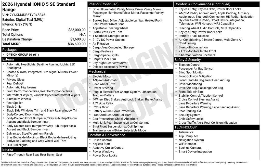 Digital Teal 2026 Hyundai IONIQ 5 SE Standard Range RWD 1-Speed Automatic Electric Motor 127/94 City/Highway MPG