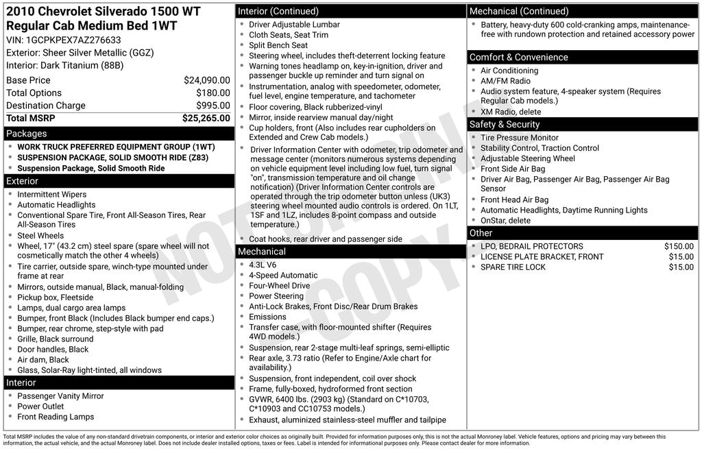 Sheer Silver Metallic 2010 Chevrolet Silverado 1500 Work Truck 4WD 4-Speed Automatic with Overdrive Vortec 4.3L V6 MPI