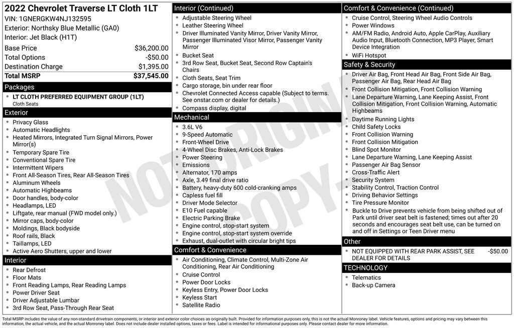 Northsky Blue Metallic 2022 Chevrolet Traverse LT 1LT FWD 9-Speed Automatic 3.6L V6 SIDI VVT 18/27 City/Highway MPG