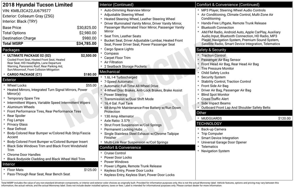 Coliseum Gray 2018 Hyundai Tucson Limited AWD 7-Speed Automatic 1.6L I4 DGI Turbocharged DOHC 16V ULEV II 175hp 24/28 City/Highway MPG