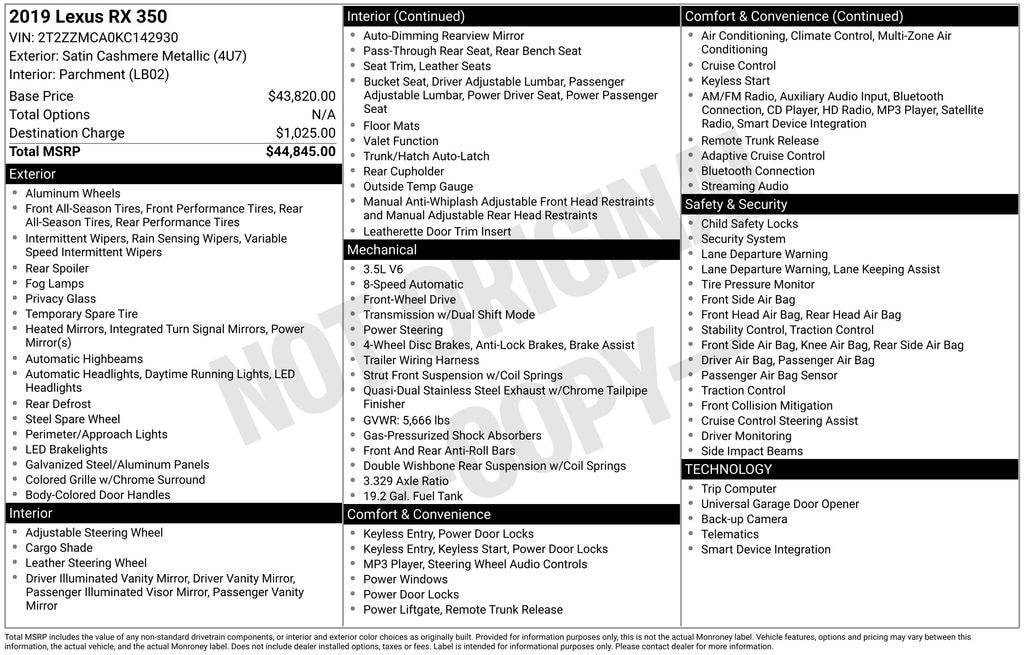 Beige Leather, ABS brakes, Active Cruise Control, Alloy wheels, Compass, Electronic Stability Control, Front dual zone A/C, Heated door mirrors, Illuminated entry, Low tire pressure warning, Power Liftgate, Remote keyless entry, Traction control, 3.329 Axle Ratio, 4-Wheel Disc Brakes, 9 Speakers, Air Conditioning, AM/FM radio: SiriusXM, AM/FM/CD Radio, Anti-whiplash front head restraints, Auto High-beam Headlights, Auto-dimming Rear-View mirror, Automatic temperature control, Brake assist, Bumpers: body-color, CD player, Delay-off headlights, Distance pacing cruise control: All-Speed Dynamic Radar Cruise Control, Driver door bin, Driver vanity mirror, Dual front impact airbags, Dual front side impact airbags, Emergency communication system: Lexus Enform w/Safety Connect, Exterior Parking Camera Rear, Four wheel independent suspension, Front anti-roll bar, Front Bucket Seats, Front Center Armrest, Front fog lights, Front reading lights, Fully automatic headlights, Garage door transmitter: HomeLink, Knee airbag, Leather Shift Knob, Leather steering wheel, NuLuxe Seat Trim, Occupant sensing airbag, Outside temperature display, Overhead airbag, Overhead console, Panic alarm, Passenger door bin, Passenger vanity mirror, Power door mirrors, Power driver seat, Power passenger seat, Power steering, Power windows, Radio data system, Rain sensing wipers, Rear anti-roll bar, Rear reading lights, Rear seat center armrest, Rear side impact airbag, Rear window defroster, Rear window wiper, Security system, Speed control, Speed-sensing steering, Split folding rear seat, Spoiler, Steering wheel mounted audio controls, Tachometer, Telescoping steering wheel, Tilt steering wheel, Trip computer, Turn signal indicator mirrors, Variably intermittent wipers, and Wheels: 18" x 8" 7-Spoke Aluminum.