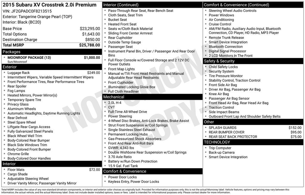 Tangerine Orange Pearl 2015 Subaru XV Crosstrek 2.0i Premium AWD Lineartronic CVT 2.0L 16V DOHC 26/34 City/Highway MPG