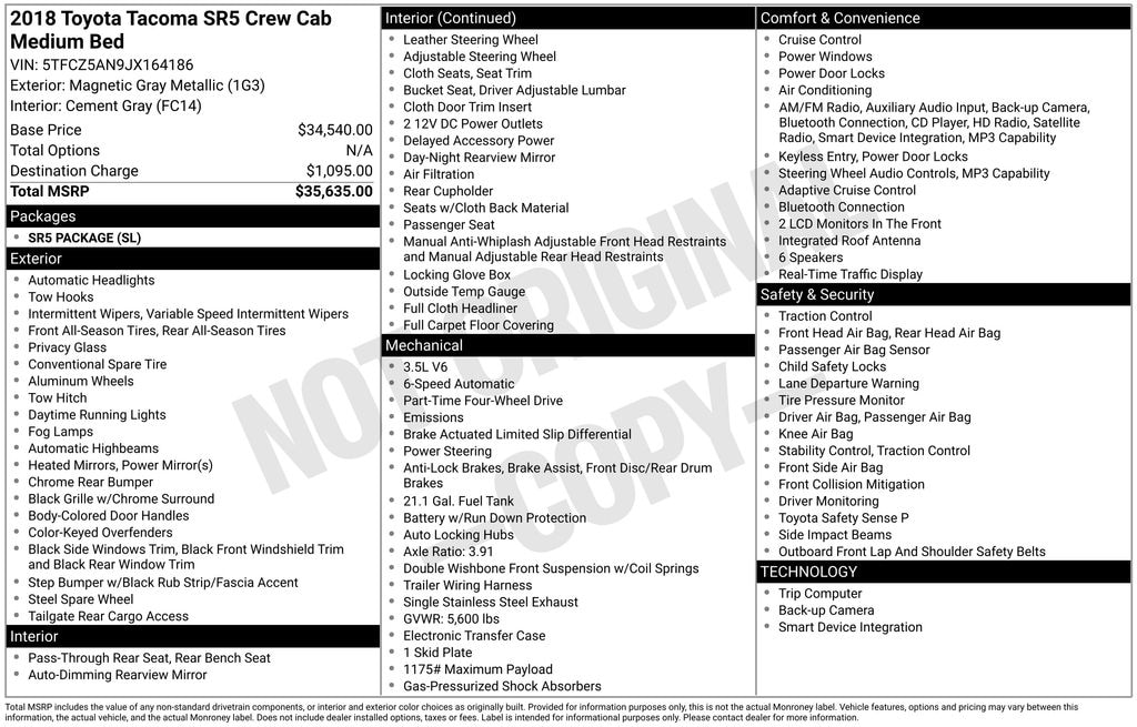 4WD, ABS brakes, Active Cruise Control, Alloy wheels, Compass, Electronic Stability Control, Illuminated entry, Low tire pressure warning, Remote keyless entry, Traction control, 16" Silver Alloy Wheels, 6 Speakers, Air Conditioning, AM/FM radio: SiriusXM, Anti-whiplash front head restraints, Auto High-beam Headlights, Auto-Dimming Inside Rear-View Mirror w/Compass, Auto-dimming Rear-View mirror, Axle Ratio: 3.91, Brake assist, Bumpers: body-color, CD player, Chrome Rear Bumper, Color-Keyed Overfenders, Daytime Running Lamps, Driver door bin, Dual front impact airbags, Dual front side impact airbags, Exterior Parking Camera Rear, Fabric Seat Trim (FC), Front anti-roll bar, Front Bucket Seats, Front Center Armrest, Front Fog Lamps, Front fog lights, Front reading lights, Front wheel independent suspension, Knee airbag, Occupant sensing airbag, Outside temperature display, Overhead airbag, Overhead console, Panic alarm, Passenger door bin, Power door mirrors, Power Sliding Rear Window w/Privacy Glass, Power steering, Power windows, Radio: Entune Plus AM/FM/CD w/Connected Navigation, Rear step bumper, Remote Keyless Entry System, Speed control, Speed-sensing steering, Split folding rear seat, Steering wheel mounted audio controls, Tachometer, Telescoping steering wheel, Tilt steering wheel, Trip computer, Variable Intermittent Wipers, and Variably intermittent wipers.