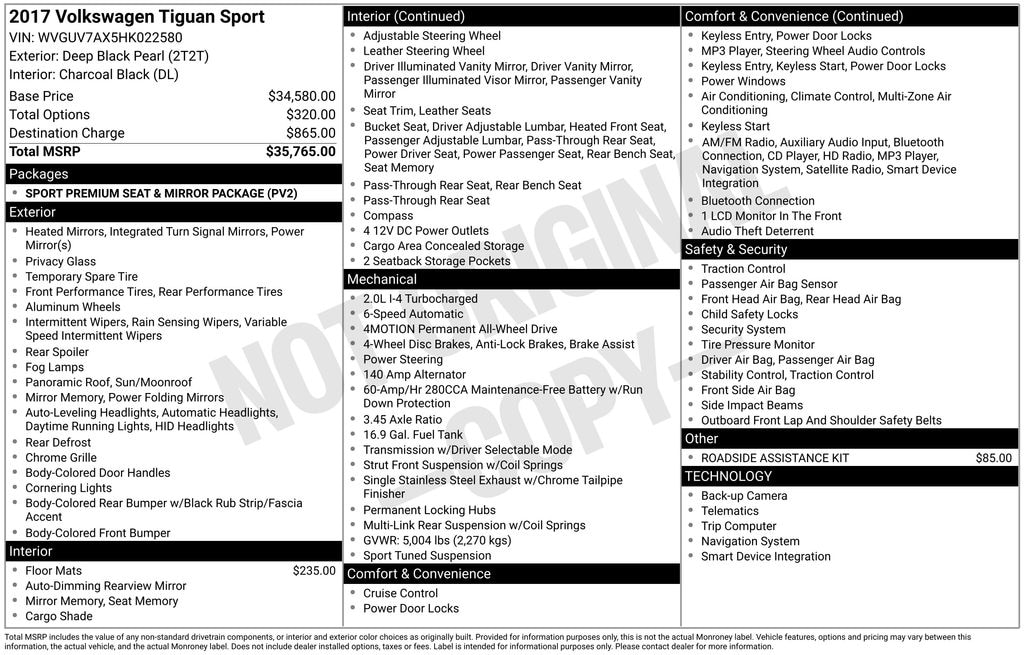 Sport Premium Seat & Mirror Package (Heated Power Adjustable Side Mirrors), AWD, 3.45 Axle Ratio, 4-Wheel Disc Brakes, 8 Speakers, ABS brakes, Air Conditioning, Alloy wheels, AM/FM radio: SiriusXM, Auto-dimming Rear-View mirror, Automatic temperature control, Brake assist, Bumpers: body-color, CD player, Compass, Delay-off headlights, Driver door bin, Driver vanity mirror, Dual front impact airbags, Dual front side impact airbags, Electronic Stability Control, Emergency communication system: VW Car-Net, Exterior Parking Camera Rear, Four wheel independent suspension, Front anti-roll bar, Front Bucket Seats, Front Center Armrest w/Storage, Front dual zone A/C, Front fog lights, Front reading lights, Fully automatic headlights, Heated door mirrors, Heated Front Bucket Seats, Heated front seats, High-Intensity Discharge Headlights, Illuminated entry, Leather Shift Knob, Leather steering wheel, Low tire pressure warning, Memory seat, Navigation System, Occupant sensing airbag, Outside temperature display, Overhead airbag, Overhead console, Panic alarm, Passenger door bin, Passenger vanity mirror, Power door mirrors, Power driver seat, Power moonroof, Power passenger seat, Power steering, Power windows, Radio data system, Radio: AM/FM/HD/CD/Navigation w/USB & Aux-In, Rain sensing wipers, Rear anti-roll bar, Rear reading lights, Rear seat center armrest, Rear window defroster, Rear window wiper, Remote keyless entry, Roadside Assistance Kit, Roof rack: rails only, Rubber Mat Kit, Security system, Speed control, Speed-sensing steering, Split folding rear seat, Spoiler, Steering wheel mounted audio controls, Tachometer, Telescoping steering wheel, Tilt steering wheel, Traction control, Trip computer, Turn signal indicator mirrors, Variably intermittent wipers, Vienna Leather Seating Surfaces, and Wheels: 18" Mallory Gray Alloy.